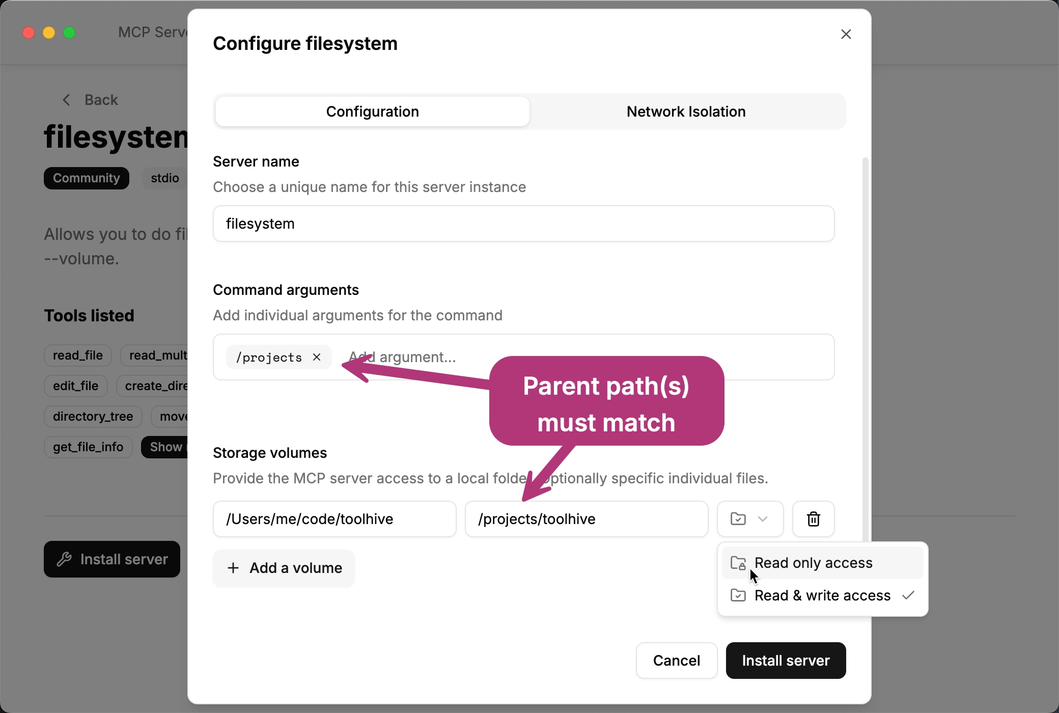 In the Storage volumes section, add local files or folders to expose to the MCP server. In the drop-down, choose whether to mount the volume as read-only or read-write.